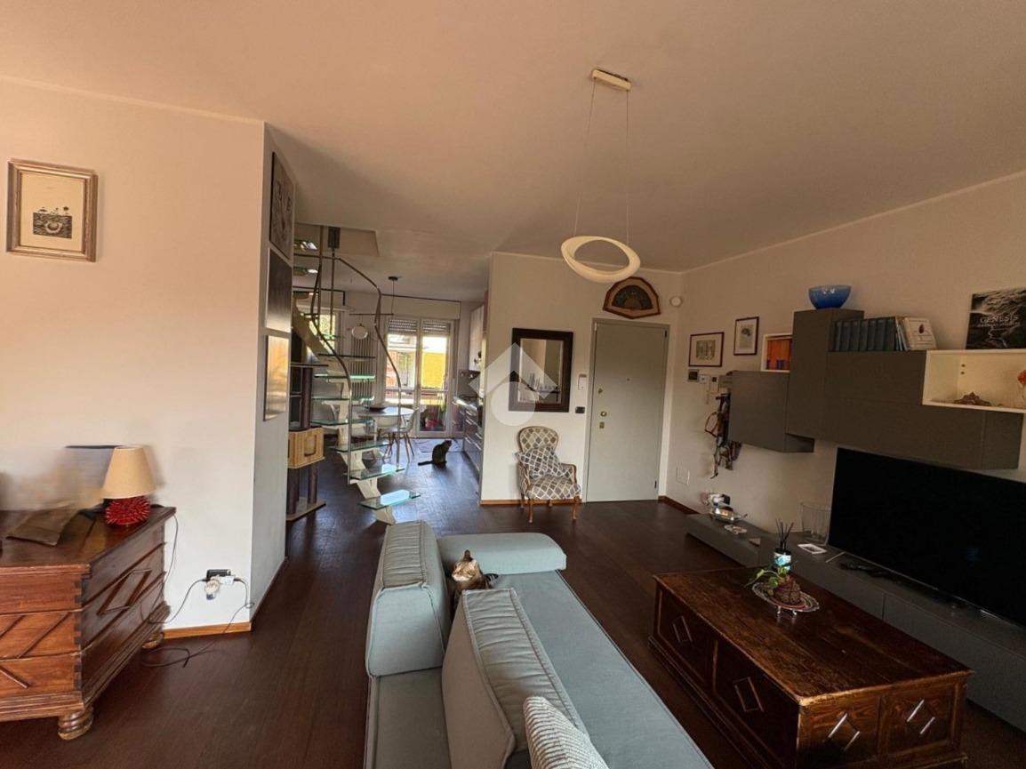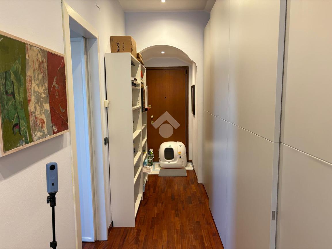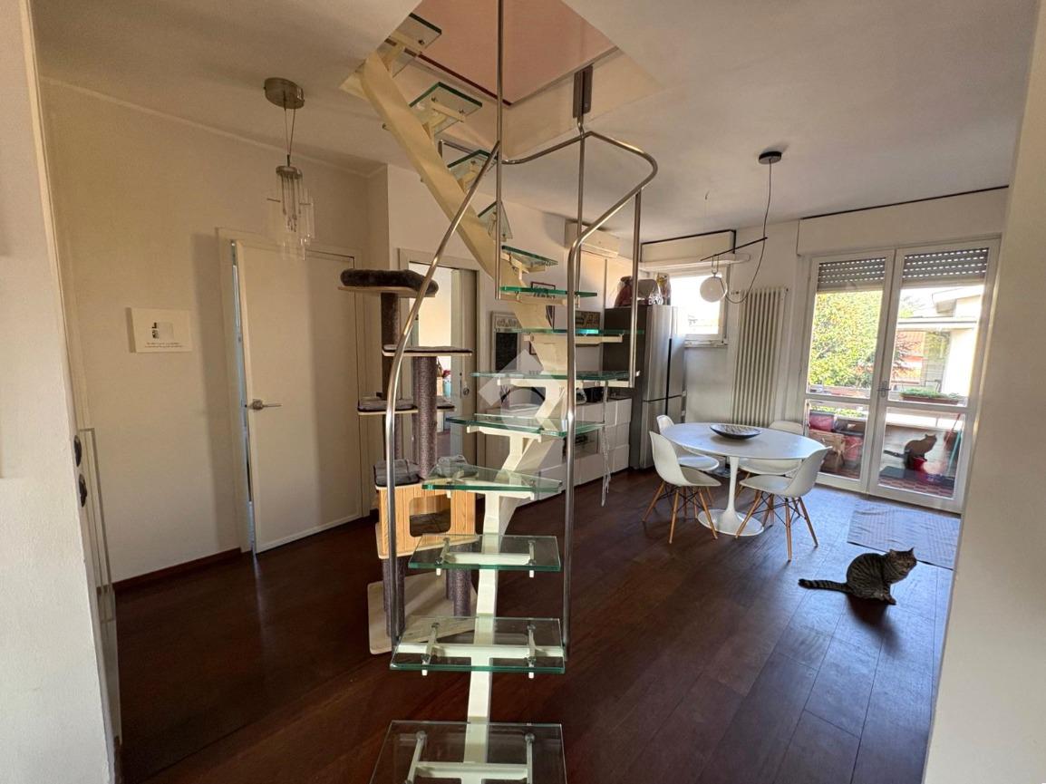 L'immobile si sviluppa su una superficie di 158 mq, distribuiti tra il terzo e il quarto piano di una palazzina degli anni '80 servita da ascensore. Il contesto condominiale in cui si trova è curato, con ampie zone verdi.